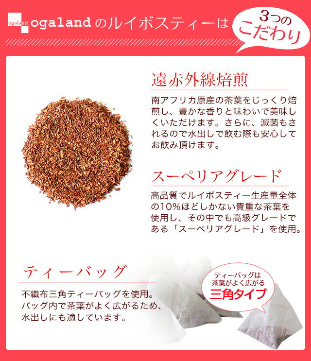 【商品名】 ルイボスティー ティーバッグ 【原材料名】 ルイボス茶葉100%※商品は原料由来の為、製造時期により色合いが多少異なる場合がございます。